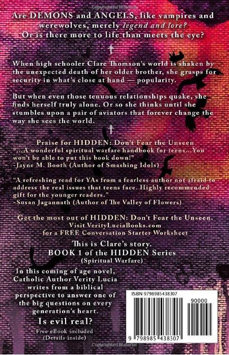 "The battle between good and evil is happening all around us; this isn't a truth that delays until we are all grown up. In Hidden: Don't Fear the Unseen, author Verity Lucia presents the reality of good and evil, vice and virtue, in a story that will be relatable to teens. Filled with real conflicts and typical teenage struggles combined with a hint of fantasy, Hidden is a fast-paced story that will capture the reader's attention and keep them on the edge of their seat. Authentically Catholic and hopeful, this suspenseful story will not only entertain teens but can challenge them to believe that the light of Christ will always overcome the darkness."