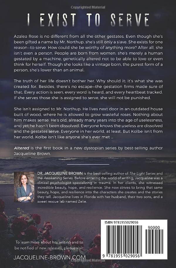 Every action is seen, every word is heard, and every heartbeat tracked. If she serves those she is assigned to serve, she will not be punished.Unfortunately, she isn’t assigned to Mr. Northup. He lives next door in an outdated house built of wood, where he is allowed to grow wasteful roses. Nothing about him makes sense. He’s old, already many years into the age of uselessness, and yet he hasn’t been dissolved. Everyone knows the useless are dissolved and the gestates serve. Everyone in her world, at least. But Kolbe isn’t from her world. Kolbe isn’t like anyone she’s ever met…Altered is the first book in a new dystopian series by best-selling author Jacqueline Brown.