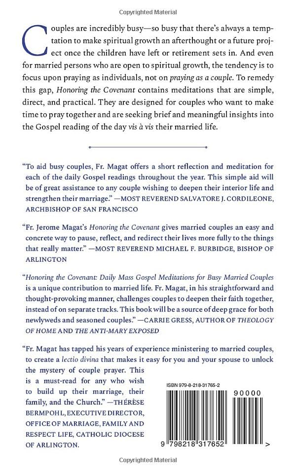 Couples are incredibly busy—so busy that there’s always a temptation to make spiritual growth an afterthought or a future project once the children have left or retirement sets in. And even for married persons who are open to spiritual growth, the tendency is to focus upon praying as individuals, not on praying as a couple. To remedy this gap, Honoring the Covenant contains meditations that are simple, direct, and practical. They are designed for couples who want to make time to pray together and are seeking brief and meaningful insights into the Gospel reading of the day vis à vis their married life.